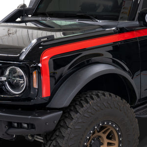 The IAG Ford Bronco BOSS Style Stripe Kit provides an easy and affordable way to customize your 2021+ Ford Bronco. This sleek graphic decal kit adds a bar of color, complemented by a refined pinstripe that extends from the front quarter panels, to the doors, then to the rear panels of the vehicle. This stripe kit was specifically designed to accentuate the contours of your four door Bronco, and is a great way to elevate the aesthetic appeal of your ride.