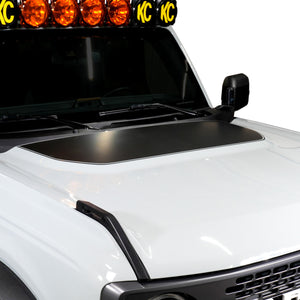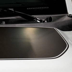 The IAG Off-Road Front Hood Graphic kit visually enhances the hood of your 2021+ Ford Bronco with a bit of custom flair. This sleek decal kit is made up of a solid color-block and features an elegant pinstripe detail that outlines the edge of the hood bump out. The matte black finish provides a seamless match between your Bronco's hood and the factory trim. IAG's Off-Road Hood Graphic is a simple, budget-friendly option to boost your Bronco's appearance and add that personal touch you're looking for.