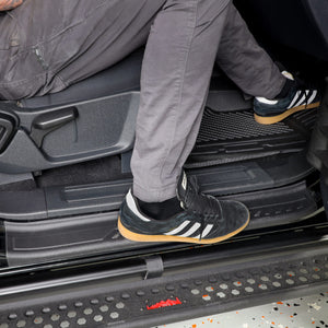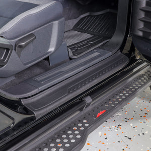 The IAG I-Line Door Sill Protectors for the 2021+ Ford Bronco 2 Door enhance the appearance of your interior while providing useful protection to the door sills. The interior door sills of the Bronco are easily scratched from people and pets entering and exiting the vehicle. The OEM painted door sills can also be slippery when wet. The IAG Door Sill Protectors are constructed of a flexible TPE material to provide an excellent all-weather, non-slip protective layer to your door sills. Each kit includes a left and right door sill protector for maximum protection on your two door Bronco.