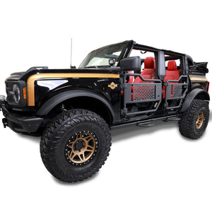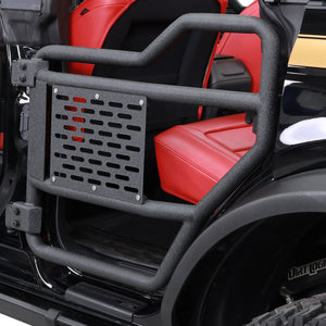 The IAG I-Line Rear Tube Doors are sold in pairs and are designed to fit 2021+ Ford Bronco Four Door models. These doors increase your visibility while allowing you to enjoy open-air driving. Your passengers will be held securely inside while enjoying off-road adventures. The doors feature a 100% bolt-on installation. They feature a durable black powder coated finish and a removable molle style panel for additional storage. The doors also feature our IAG logo available in five optional colors. Each door includes all necessary hardware for installation. Optional padding kits (not included) may be purchased separately. Please note that these doors are intended for off-road use only.