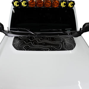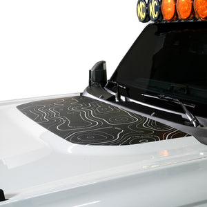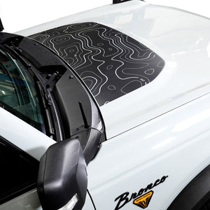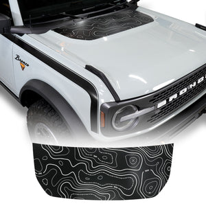 The IAG Front Hood Topography Graphic Kit transforms the hood of your 2021+ Ford Bronco with a bit of custom flair. The empty bump out space at the top of the hood is the perfect spot for this topographic map-inspired hood graphic that accentuates your Bronco’s adventurous side. This sleek decal kit is precision cut to fit inside the chamfered area of the hood, and features a subtle, matte black finish. The topographic lines are cut away to reveal your Bronco's color beneath.