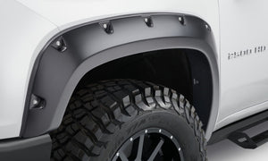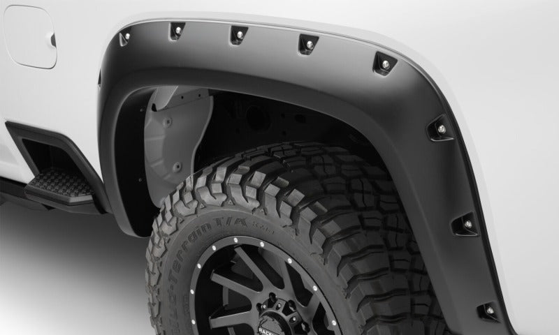 With their recessed stainless steel bolts and massive presence, Pocket Style Fender Flares are a Bushwacker original and an off-road icon. They give you the hard-core look of bolt-on flares, with no body-side sheet metal drilling required. Pocket Style Fender Flares are custom-designed for your vehicle to complement oversized tires and high-clearance lift kits. You can mount them right out of the box with their tough, OEM-style matte black finish they're UV protected so they won't chalk. You can also paint them to match or accent the body color for a factory-custom look. Pocket Style Fender Flares are made from our thick, warp-resistant Dura-Flex 2000 material and tailor-made for added durability and flexibility on the trail. When you need maximum tire coverage with minimum time and effort, it's in the pocket. Pocket Style Fender Flares from Bushwacker.