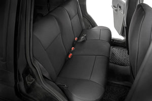 Want to protect your seats or are your seats showing signs of wear and tear from daily use? Say goodbye to unsightly stains and deterioration with Rough Country's Neoprene Seat Covers - the ultimate solution for preserving your vehicle's interior. Snug Fit for Optimal Protection: Our seat covers are tailored to fit your seats perfectly, providing a protective barrier against spills, scratches, and everyday wear and tear. Factory-Spec Construction: Engineered to meet factory specifications, our covers blend seamlessly with your vehicle's interior, giving it a fresh, new look without compromising on quality or style. Four-Layer Defense: With a four-layer construction featuring foam padding and a durable polyester shell, our seat covers offer unmatched protection and longevity, ensuring your seats stay looking new for years to come. Breathable and Water-Resistant: The neoprene layer not only provides breathability for added comfort but also boasts water-resistant properties, safeguarding your seats from spills and stains. Complete Coverage: Our covers come with full protection for your front seats, including headrest covers where applicable, as well as rear covers to shield your back seats from children and pet-related mishaps. Peace of Mind Warranty: Rest easy knowing your purchase is backed by our two-year warranty, giving you confidence in the durability and reliability of our product. Don't let worn-out seats diminish your driving experience. Upgrade to Neoprene Seat Covers today and enjoy a fresh, stylish interior that's protected against the rigors of daily life on the road.