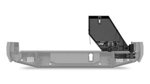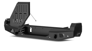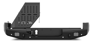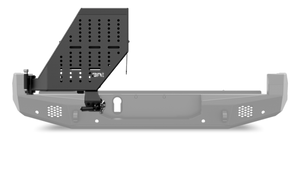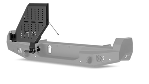 Discover the ultimate adaptable storage solution, designed to mount almost anything you need, from spare tires and jerry cans to tread boards, Rotopax, Hi-Lift jacks, and storage cases. This versatile accessory can be added to your bumper at any time, featuring a built-in foldable table for added convenience. With pre-drilled holes for mounting flexibility, it includes a robust compression latch with a locking pin and serviceable bearings for reliable performance. The brushed aluminum knurled locking pin and stopper prevent over-extension of the swing, ensuring durability. Enjoy easy bolt-on, no-drill installation, though the optional tire/accessory mount is not included. Rated up to 130lbs, this accessory is finished with a durable two-stage light texture black powder coat and comes with a 3-year finish warranty and a limited lifetime warranty. Equip your vehicle with this essential upgrade for unmatched versatility and reliability.