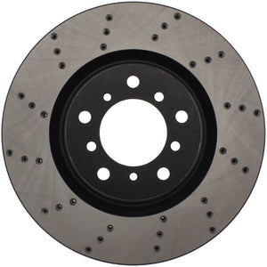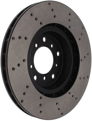StopTech Drilled Sport Rotors are 1-piece direct replacement brake discs for factory brake systems and stock calipers that look great behind your wheels – and offer significantly improved braking performance. The unique cross-drilling aids with heat and brake dust dispersal, prevents glazing of the pads, adds bite and improves wet and dry braking performance. Built to last, the black e-coating provides protection from corrosion and the high carbon metallurgy (in most applications) offers quieter operation, better crack resistance and increased performance.