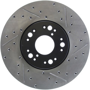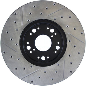 StopTech Drilled and Slotted Sport Rotors are 1-piece direct replacement brake discs for factory brake systems and stock calipers that look great behind your wheels – and offer significantly improved braking performance. The unique cross-drilling and slotting aids with heat and brake dust dispersal; prevents glazing of the pads; adds bite and improves wet and dry braking performance. Built to last; the black e-coating provides protection from corrosion and the high carbon metallurgy (in most applications) offers quieter operation; better crack resistance and increased performance.