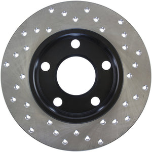 StopTech Drilled Sport Rotors are 1-piece direct replacement brake discs for factory brake systems and stock calipers that look great behind your wheels – and offer significantly improved braking performance. The unique cross-drilling aids with heat and brake dust dispersal; prevents glazing of the pads; adds bite and improves wet and dry braking performance. Built to last; the black e-coating provides protection from corrosion and the high carbon metallurgy (in most applications) offers quieter operation; better crack resistance and increased performance. Warranty