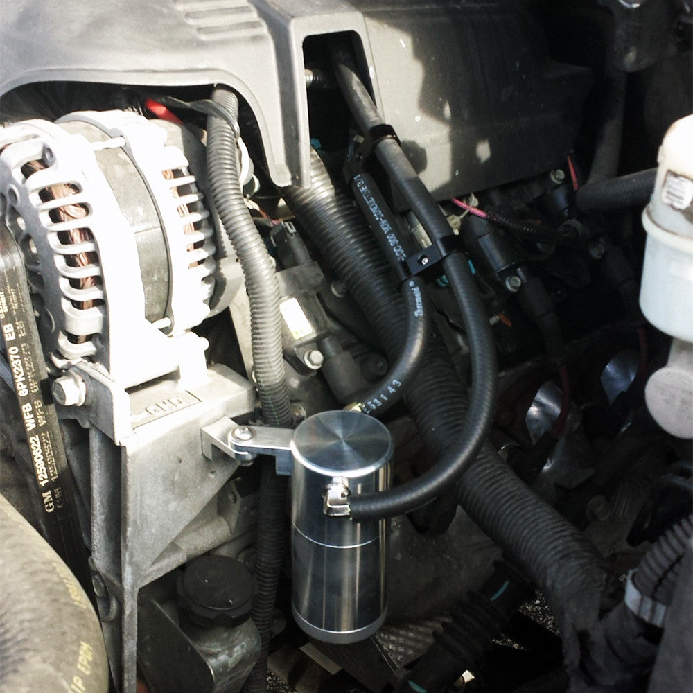 Brand New UPR Billet Catch Can Kit for your 1997-2013 Chevrolet Silverado or Tahoe with 4.8L, 5.3L, 6.0 or 6.2L Engine. This kit features an engine mount for vehicles with dual batteries or just looking to keep it close to the engine. Developed to eliminate oil from entering your intake by engine blow-by, which channels oil and trash into your direct air stream from the valve train. This is a common problem on both brand new performance and especially older engines, which just suffer more from blow by due to wear and tear. The most common problem is making your car emit light blueish white smoke upon start up or even during normal driving. The throttle body handles your main air stream and has a breather tube running from the crankcase to the throttle body. The vacuum from the incoming airstream and positive pressure in the crankcase combine to get oil in the air tract. Every car and vehicle is set up this way to help eliminate the pressure build-up in the bottom end of your engine enabling the piston to move up and down with less resistance. These catch cans feature a containment system and separator that force all the debris to get captured and contained in the filter while still allowing airflow thus maintaining full function of the breather system. This catch can has been long awaited and is one of the most needed items for the late model performance world. We have had countless customers install our new Aerospace Mustang Billet Catch Can and get immediate results in both idle quality and vehicle performance. Another key problem caused by oil in the intake is that it reduces the octane of your fuel and causes detonation especially in turbo, supercharger and nitrous applications.