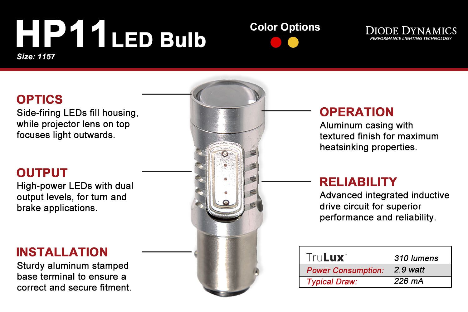 Upgrade. Add more light output and a modern appearance to your vehicle with the 1157 HP11 turn signal bulb. Populated with four side-firing 1.5W LED chips and one 5W LED chip with a projector lens on top, the HP11. Housed in an aluminum casing for maximum heatsinking properties, the HP11 will last for years to come. Best of all, installation only takes minutes - simply take out your factory bulb and the HP11 will fit snugly in the socket.