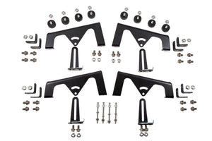 Included in the box: Full bracket set. Eight (8) 8-32 Stainless Steel Hex Nuts. Four (4) 8-32 Stainless Steel Hex Screws. Eight (8) Dzus 1500 Series Spacers. Eight (8) M6 Custom-Designed Bumper Feet. Twenty-four (24) M6 Stainless Steel Flange Bolts. Twenty-four (24) M6 Stainless Steel Flange Nuts. Installation Guide.