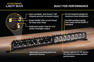 Designed for Performance. Each Stage Series Light Bar has been engineered from the ground up with the most modern optical, thermal, and circuit board technologies to provide more output than any other light bar on the market. Unlike reflectors, TIR optics capture and focus nearly all of the light output, shining it only where you need it, without glare or wasted light.