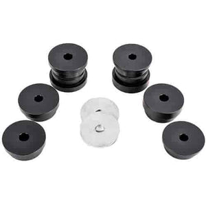 Eliminate rear cradle movement in your S550 Mustang with a Delrin Rear Cradle Bushing Kit from BMR Suspension. The OE bushings are designed with air pockets and are made from soft rubber. These ?voids?, coupled with soft material produce excessive differential movement during normal and aggressive driving. These bushings are CNC-machined from Delrin, which is known for its high stiffness, low friction and excellent dimensional stability. This material eliminates deflection with only moderate increases in NVH. Each bushing is machined to exact tolerances, which are designed by BMR. This allows for a perfect fit and increased performance for any driving style. The BMR Delrin Rear Cradle Bushing Kit (BK048) greatly increases the rigidity and stability of the chassis to provide maximum control and consistency necessary for any form of competition or high performance street driving. Designed for max effort street performance, drag race, and handling applications, BMR Suspension BK048 Delrin Cradle Bushings are the perfect wheelhop solution for any S550 Mustang where NVH is not a concern. BMR's Delrin cradle bushings replace the entire OE rubber bushing, eliminating differential movement by replacing the soft rubber OE bushings with solid two-piece Delrin bushings. These bushings remove all movement between the rear cradle and chassis, eliminating the deflection that occurs during acceleration, cornering, and braking. This reduces wheelhop and increases handling stability, while giving you a much-improved overall feel in any performance driving situation. BMR Suspension's BK048 Differential Bushing Kit is available in black with zinc-coated hardware. Installation time is about 3-4 hours and may vary depending on stock bushing removal technique. Proudly made in the U.S.A.!