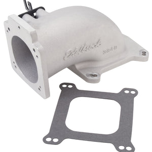 This Edelbrock Low Profile elbow was designed for limited hood clearance applications. This adaptor can be used with our 29085 Victor Jr LS1 but cowl trimming and an SS hood are required. The 3848 Elbow can be used in other square bore (4150 style) manifold applications as well. It can be mounted forward, backward, or sideways on any of our Victor EFI Square bore (4150) style manifolds. Because of its low profile a one inch spacer is required for small or Big Block Chevy forward mount configurations to clear the water neck. It can be used with an LS1 80 mm (must use PN 2737 adaptor) or Edelbrock PN 3869 90mm Universal, or Ford style 75mm throttle bodies. The 3848 adaptor features: Bolt pattern fits LS1, LS2 and Ford 5.0l based throttle bodies, adapts to standard (4150 style) square bore manifolds, Fits manifold either in a forwards, backward, or sideways configuration, The throttle bore center sits 7.00" forward and only 2.00" up from the manifold 4150 flange, The throttle body points downward on a 5 Deg angle. For ultra-low applications out PN 3847 elbow sits 9.00" forward and only .56" above the flange, with a 12 Deg downward throttle body angle.