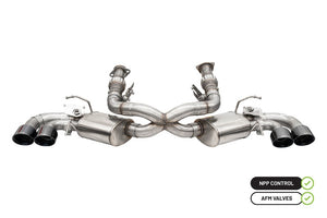 CORSA Performance C8 4 Valve NPP Exhaust. The Ultimate Driver's Exhaust System. Total Control. Incorporating the latest technologies from CORSA Performance, our 4 Valve NPP C8 Corvette exhaust system features valved sound control, paired to our most advanced RSC(R) No Drone Technology to deliver complete control of the driving experience. Each 4 Valve exhaust system features CORSA's exclusive cast valve assembly completely redesigned to meet the intense heat needs unique to the C8 Corvette. Valve assemblies mate seamlessly to the stock actuator motors allowing the driver to maintain all C8 driving sound modes without throwing a Check Engine Light. Both Louder (+9 decibels) and quieter (-1 decibel) than the stock system, the C8 Performance exhaust unleashes exhilarating exhaust notes from the 6.2L LT2 engine with the refined driving experience only a CORSA exhaust can provide.