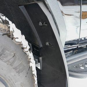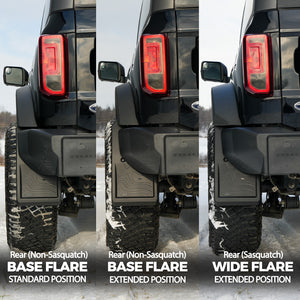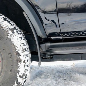 The IAG Bronco Trail Shield Mud Flaps surpass ordinary mud flap designs with innovative features and versatile fitment options. Sold as a complete set for the right and left front and rear wheel wells, they feature an adjustable width to fit both narrow (non-Sasquatch) and wide (Sasquatch) fenders while remaining fully compatible with Sasquatch package wheels and tires. They’re designed to work with all OEM running boards, side steps, rock rails, and even OEM crash bars, making them a seamless addition to any 2-door or 4-door Bronco. Whatever your setup, these mud flaps have you covered.