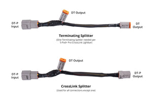 Power your Stage Series CrossLink Lightbar. These splitter wires are used to connect the SS5s on a 5-8 Pod Pro CrossLink Lightbar. All SS5 pods come standard with a DT 4-pin connector on the back of the pod. Due to power requirements, 5-8 Pod Pro CrossLink Lightbars require an Ultra Heavy Duty Wiring Harness to power the bar, which uses a DT-P 4-pin connector. Both CrossLink Splitters and a Terminating Splitter must be used to daisy-chain the SS5s together and connect to the wiring harness.