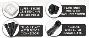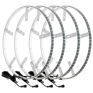 NEW! Double the LEDs. Double the Brightness! Are you looking for the brightest and most attention-grabbing LED wheel ring kit on the market? Look no further than the all-new Double-Wide LED Wheel Ring Kit from ORACLE Lighting! With over 600 LEDs these rings make a powerful impact on any vehicle! The all-new design features Plug and Play waterproof connectors for easy installations. Each ring has over 12" of insulated cable that connects to a wiring hub which makes installation easier than ever. The rings now include (5) mounting brackets per ring and have tapped fittings to easily move and adjust brackets to fit any application. The ring diameter has been increased to 16.5" to fit oversized performance brake systems. ORACLE Lighting illuminated LED wheel rings are an easy and effective way to light up your truck's wheels and suspension! This head-turning lighting product consists of a set of (4) LED illuminated aluminum rings which install around the brake rotor and attaches to the brake dust shield. These can also be mounted to older vehicles with drum brakes. The effect is a large ring of light which accents custom wheels and stands out at events. Oversized 16.5" diameter is the largest on the market and fits oversized brakes. Each ring is equipped with 162 super-bright 2835 LEDs (648 LEDs total) which will outshine any competitors. Installation Instructions
