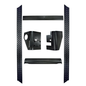 Get that off-road look with Rugged Ridge Body Armor! Each Body Armor piece is constructed of black diamond plate looking UV treated thermoplastic for the coolest, toughest looking up-grade for your Jeep. Each body armor attaches to your Jeep with ultra strong 3M tape to ensure a secure fit (front guard also may require some under hood drilling). Have a scratch or dent on your paint? Cover it up with body armor! Simply fill in the scratched area with touch-up paint (to prevent rust) and install the Body Armor. You have now repaired and upgraded! Includes Front Frame Cover, Rocker Side Cover Pair, Rear Corner Guard Pair, and Rear Tailgate Sill. Installation Instructions Warranty