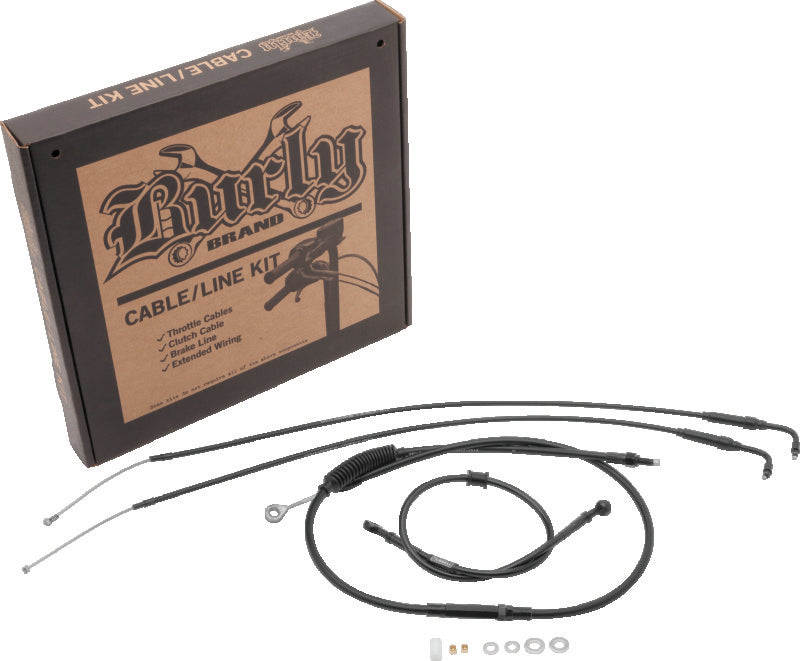 Burly Brand cable/line install kits take the guesswork out of installing your handlebars. Provides the correct length cables and brake lines you need so you can complete a handlebar swap. Kit includes shortened single-disc black braided steel brake line, shortened clutch cable, shortened throttle cables and all necessary wiring