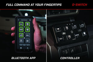 Fast, Responsive Bluetooth App. To activate and use the D-Switch, you can use the included controller, or control it using your phone through the Bluetooth App. That’s where you’ll configure and customize things as well. Say goodbye to switch panel apps that lag, freeze, or don’t connect. The D-Switch Bluetooth app for iOS and Android delivers instant response and easy programming with no loading screens or connection delays for a seamless and fast experience, every time. The app allows you to pair up to four individual D-Switch units for ultimate control over your entire setup.