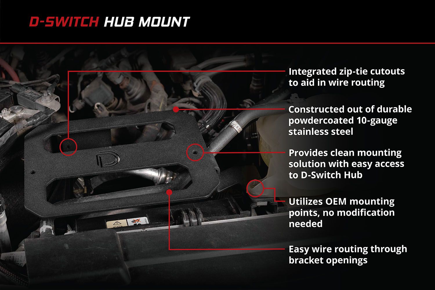 Unsure of where to mount your D-Switch Hub? Check this out! The D-Switch Hub Mount Kit for the Ford F-150 eliminates the guesswork and provides a simple, bolt-on mounting solution. This kit bolts directly to OEM mounting points in the engine bay, without interfering with the fuse box or battery, and allows for easy access to the D-Switch Hub.