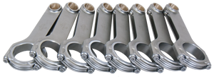 Eagle's 4th Generation H-Beam rods are forged from proprietary alloy steel in a two-piece forging and feature a fully CNC machined and shot-peened surface. Eagle's 4th Generation design features thicker beam webbing for increased power handling capabilities, Increased beam and cap contact area and shoulder area to inprove bore stability under high load, and new small end profile to reduce reciprocating weight. Sizing is held to exact tolerances. Sold as a weight-matched set. Equipped with ARP 2000 bolts. Recommended for competition use.