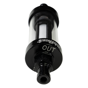 Edelbrock Clear View Fuel Filter for 5/16" I.D. Hose dresses up any carbureted car’s engine bay, providing a quick visual check of fuel flow and condition. Fully machined aluminum ends are laser inscribed with barbed inlet/outlet sizes and attractively E-coated black for durability. For use with rubber fuel lines rated up to 10psi. A serviceable 100-micron nylon filter element keeps dirt and debris from clogging up small passages in your carburetor. The filter element is easily replaced using kit PN 8749.