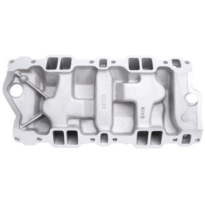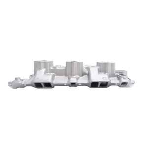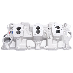 Edelbrock part #5418 C-357-B Triple-Deuce intake manifold is designed for 1955-86 262-400 c.i.d. small-block Chevys, this manifold has a balanced 180-degree firing order port runner arrangement. It contains an exhaust gas heat crossover and offers excellent performance potential. This intake manifold has machined front oil filler tube pad with boss and is machined for 3-bolt carburetors. Carb center-to-center: 5-1/2". Use with Performer-Plus camshaft and lifter kit #2103 for low-end torque or Torker-Plus cam/kit #5002 for top-end power.