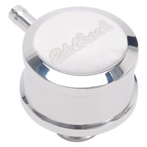 Edelbrock part #4407 Billet Polished Aluminum Breather with 90 deg. PCV port which looks like a traditional breather for standard 1.250" valve cover holes. The breather housing has an internal PCV with a 90 deg. port to attach a hose. This breather is round and is 2.50" at the base with a slight cone shape. Overall height is 2.49".