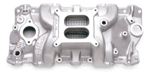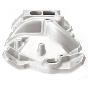 Edelbrock part #7101 Performer RPM intake manifold is designed for 1955-86 262-400 c.i.d. Chevy V8's for maximum power and a broad torque curve for high- Performance'street/marine engines. Provides power like a single-plane and throttle response like a dual-plane. Has provisions to machine for an oil fill tube. No provisions for exhaust heated or stock-style choke. Accepts late-model water neck, air-conditioning, alternator and H.E.I. Will fit cast iron Chevrolet Bowtie heads, but will not fit 1987 and later cast iron heads. Intake manifolds will not fit under stock Corvette hood. Installation Instructions Warranty