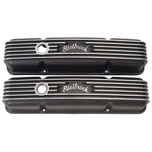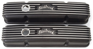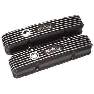 Edelbrock part #41443 Classic Series Valve Covers are designed for Chevy 262-400 V8 1959-86 (with oil fill hole) applications and have a Black powder coat finish. Edelbrock first made these aluminum valve covers in the late '50s and they're still a classic. Made of heavy-gauge sand-cast aluminum, Overall height is measured from base to top at the highest point. Edelbrock classic valve covers can be machined to accept breathers if desired. Warranty
