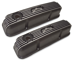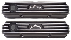 Edelbrock part #41623 Classic Series Valve Covers are designed for Ford FE V8 1958-1976 applications. Edelbrock first made these aluminum valve covers in the late '50s and they're still a classic. Made of heavy-gauge sand-cast aluminum with a Black powder coat finish. Overall height is measured from base to top at the highest point. Edelbrock classic valve covers can be machined to accept breathers if desired. May not clear some power brake boosters on Ford FE applications. Warranty