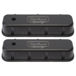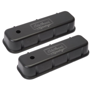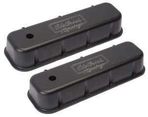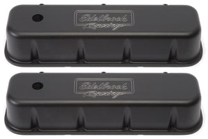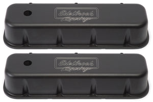 Edelbrock part #41803 Victor Series Valve Covers are designed for Chevy 396-502 1965 & Later applications. Our Victor Series valve covers have a finely textured black powder coated finish for a pleasing and unique appearance. This is the same finish you'll find on our top-of-the-line Edelbrock/Musi 555 Crate Engine. These valve covers are manufactured from die-cast aluminum and machined with 1-1/4" breather hole. Overall height is measured from base to top at the highest point.