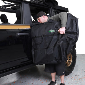 The door storage bags are easy to use. Simply unzip the bag, slide it over the open door and partially zip it back up to secure it to the door. Your door is now fully protected while you remove the hinge bolts. The included carrying strap allows you to easily hold the door once it’s removed.