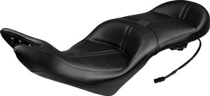 Mustang's one-piece touring seat features a wide bucket radius for both the front and rear seating areas, as well as a slightly lower seating position for both. Not only does Mustang's more comfortable design let the driver sit back into the 17.5" wide seat but the front nose area has been designed to eliminate that "crowded" feeling. The lower nose area also helps ensure that one's boots more securely reach the ground. The built-in driver backrest is fully adjustable, easily removable and offers more features than any other backrest on the market. The passenger is fully supported in a 15.5" wide bucket that is contoured for comfort.