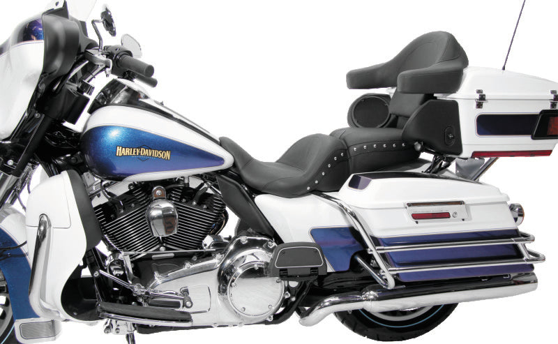 Available with or without a fully adjustable and easily removable driver backrest, the rider's bucket is shaped and angled for optimal touring posture on the go. It also drops you from the stock position on most models and is cut narrow at the front so you can plant your feet firmly on the ground at a stop. The 16.5" wide front bucket and the 14" wide rear seat are available plain or with studs (either chrome or chrome with black pearl centers). Seat will fit with a handrail. Will not work with H-D® or Mustang Driver Backrest kits.