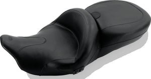 Both you and your passenger will experience the peak of comfort with the Summit Super Touring Seat, designed specifically for Harley-Davidson® Rushmore models. The one-piece "Super" comfortable touring design with extra-wide passenger seat provides riders with the fullest, most comfortable seat possible. The 19" wide Super front bucket sits the driver 1.75" further back than the stock seat. The passenger seat is a full 16" wide and fits perfectly with the Rushmore speakers and Tour-Pak. Seat will fit with a handrail, but will not work with H-D or Mustang driver backrest kits. Receiver for the optional driver backrest is built into the seat.