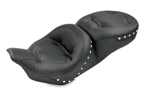 Mustang's one-piece Standard Touring features a contoured bucket for good lower back support, and a nose narrower than stock for easier ground reach when stopped. The Regal style features soft pillow comfort with just enough folds and pleats to allow the cover full freedom to flex and conform, tufted with hand-tied vinyl-covered buttons for a luxurious classic pillow-top look. The 17" wide front bucket and the 14" wide rear seat are available plain or with black pearl-centered chrome studs. The baseplate is open in the middle to accept H-D or Mustang driver backrest kits.
