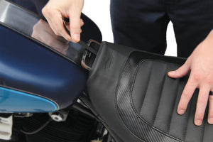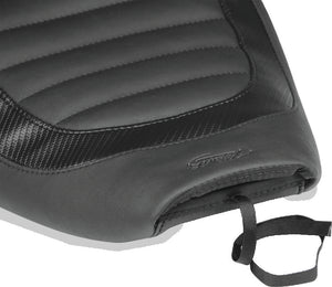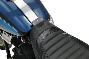 Jody Perewitz, the fastest American woman on a V-Twin, has designed this low and lean solo seat for the '82-'94 and '99-'00 FXR models. The 11.5" wide seat is built with quality in mind, drops the rider lower compared to stock, and features a marine-grade fiberglass baseplate and classic tuck & roll stitching framed by a carbon-fiber vinyl insert. Includes a fender nut for ease in installation. The convenient pocket in the seat's nose measures 3.5" wide by 6.5" deep, suitable for storing small essentials.