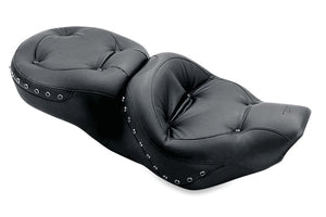 Mustang's one-piece ultra comfortable Standard Touring design provides the rider and passenger with the fullest, most comfortable seat possible. The seat nose is narrower than stock so that the rider can more easily plant feet on the ground. The 17" wide front bucket and the 14" wide rear seat are available plain or with black pearl-centered studs. The baseplate is open in the middle to accept a Mustang or H-D driver backrest kit.