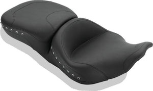 Mustang's new one-piece Super Touring moves the rider approximately 1" back from stock. The 19" wide driver seat provides maximum comfort and support while the 14" wide passenger seat enables both riders to enjoy maximum comfort. The seat is contoured to better clear the saddlebag lids and is split to accept the stock or Mustang driver backrest kit, sold separately. This studded seat features black pearl-centered studs.