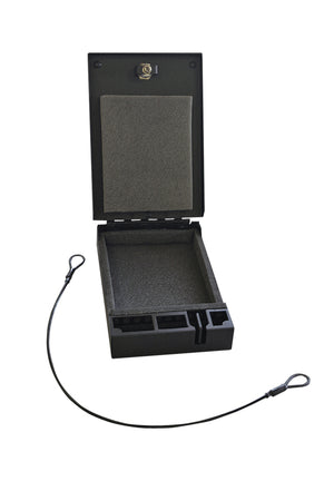 Weighing less than 3 lbs., this lockable welded steel storage box can be used to secure a firearm and protect valuables while carrying it by hand between locations, during travel, inside a vehicle, home or office. Keyless entry is provided by Tuffy’s 3 digit combination lock with a two-point steel cam for added security. The included 2 ft. long, 2000 pound test, steel security cable secures the safe to any sturdy mounting surface by attaching to the 1/8 inch steel security cable anchor point. The inside is lined with low-density foam to protect the contents, while compression bumpers keep the lid vibration-free when closed.