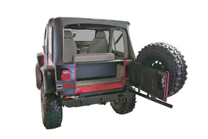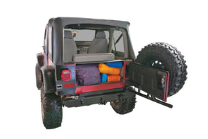 This tailgate security enclosure is a simple, one-piece hinged design that creates a lockable storage area completely protected on all sides. The patented design works in conjunction with the lockable vehicle tailgate and the existing vehicle geometry to secure the area created without the need for a rigid panel connection, any releasable lock mechanisms or other unnecessary hardware. The innovative design eliminates the burden of having to bolt a bunch of panels together. The enclosure maintains the use and function of the rear seat in 2-door models. Quickly and easily installs using standard hand tools with an OEM hardtop or soft top. The assembly easily removes with the use of tools to allow for storage of larger items. On Jeep Wrangler YJ vehicles, the rear tailgate lock must be locked manually with the Jeep key in order for the Tuffy enclosure to function as a secure storage device. Installation Instructions