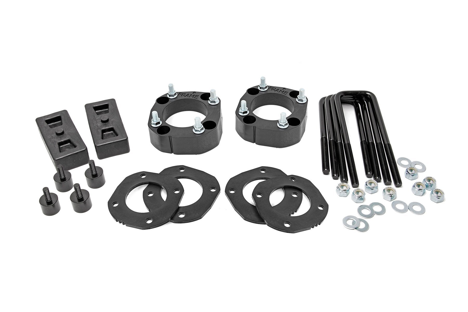 Rough Country's 2.5" - 3" Leveling Suspension Kit for Toyota Tundra is the most innovative way for you to level the front of your vehicle with the rear, allowing you to dial in the angle you desire. Featuring a set of front, upper strut extensions, this kit can accommodate up to a 33" tire. This kit now includes two sets of 0.25" spacer shims, which can be used in addition to the strut spacers to fine-tune your level angle. Each shim provides roughly 3/8" of lift. Use both for a full 3" level, or fewer to leave a little rake in the front end angle - this is specifically great for individuals who prefer a slight nose down look for an aggressive head-on view, or routinely pull trailers and haul items that would potentially draw the nose up from a full level stance. Designed by Rough Country's in-house Research and Development team, these components are engineered for a precise fit and incorporate superbly with factory equipment. 100 % bolt-on installation makes setup a breeze, and all components are protected by Rough Country's Lifetime Replacement Warranty.