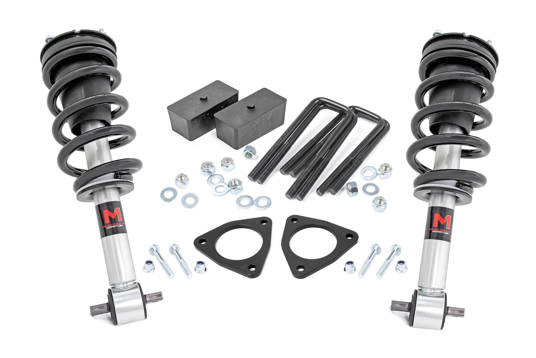 Level your vehicle from front to rear while preserving the smooth, factory ride quality with Rough Country's M1 Strut Leveling Kit! This easy-to-install kit boosts the front end, removing the unsightly factory rake and giving your truck increased ground clearance and aggressive good looks.Rough CountryΓÇÖs N3 Struts feature a massive bore and chrome plated piston rod with leak-proof piston seal for exceptional durability during off-road use. Each strut is tuned to OEM specs and includes a variable dampening system for outstanding handling and control on all road conditions. These struts offer improved tire contact with the road for increased stability and performance. Each lifted strut is a full replacement of your OEM equipment, engineered for a pain-free installation. Simply remove the factory strut and replace for an instant upgrade! No complicated strut disassembly required!