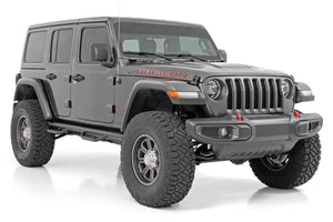 When it comes to your four-door Jeep JL Rubicon Unlimited, we know you need a lift that won't let you down. Our 3.5 Inch Lift Kit delivers legendary off-road prowess and smooth on-road handling.\Increased Ground Clearance: Get ready to conquer those rocky trails and rough terrains like a boss! Our lift kit gives your Jeep Wrangler Rubicon Unlimited the extra inches it needs to clear obstacles with ease.\Front-to-Rear Leveling: Tired of that nose-down stance? Ditch the unbalanced Jeep life with our leveling kit. We bring symmetry to your ride, lifting the front to match the rear, giving you a smooth and steady journey.\Tuned Coil Springs for Superior Performance: Your Jeep's handling and ride quality matter, and we get that. Our coil springs come dialed in with OEM spring rates, delivering top-notch handling and a plush ride. Our linear coil rate springs take it up a notch, ensuring impeccable handling and stability, even when the terrain gets wild.\Additional Tire Clearance: Who doesn't want bigger, beefier tires? Our lift kit makes room for larger tires (up to 35 inches), giving your Jeep a more aggressive look that will turn heads on and off the road!\Heavy-Duty Track Bar: Our included track bar is an absolute beast, constructed from forged solid steel for unparalleled strength and durability. With its massive 1.25-inch outside diameter and rugged OEM-style rubber bushings, it's built to handle anything the off-road throws its way.\Durable CV Driveshaft: The factory shaft does not have adequate clearance once lifted and will cause damage to the Rzeppa joint if the driveshaft spins while the suspension is fully flexed or articulated. Rough Country's extended Front CV Driveshaft eliminates this issue allowing you to flex your suspension with more peace of mind!\Easy Installation: We know you'd rather be off-roading than in the garage all day. That's why our lift kit is designed for easy installation, so you can hit the trails in no time.\At Rough Country, we understand that no two off-road journeys are the same. That's why our 3.5-inch kit is fully adaptable, allowing you to select your preferred shock series, be it the nitrogen-charged N3 shocks or the premium Vertex Reservoir shocks. With Rough Country, you're not just upgrading your Jeep; you're defining your off-road legacy.