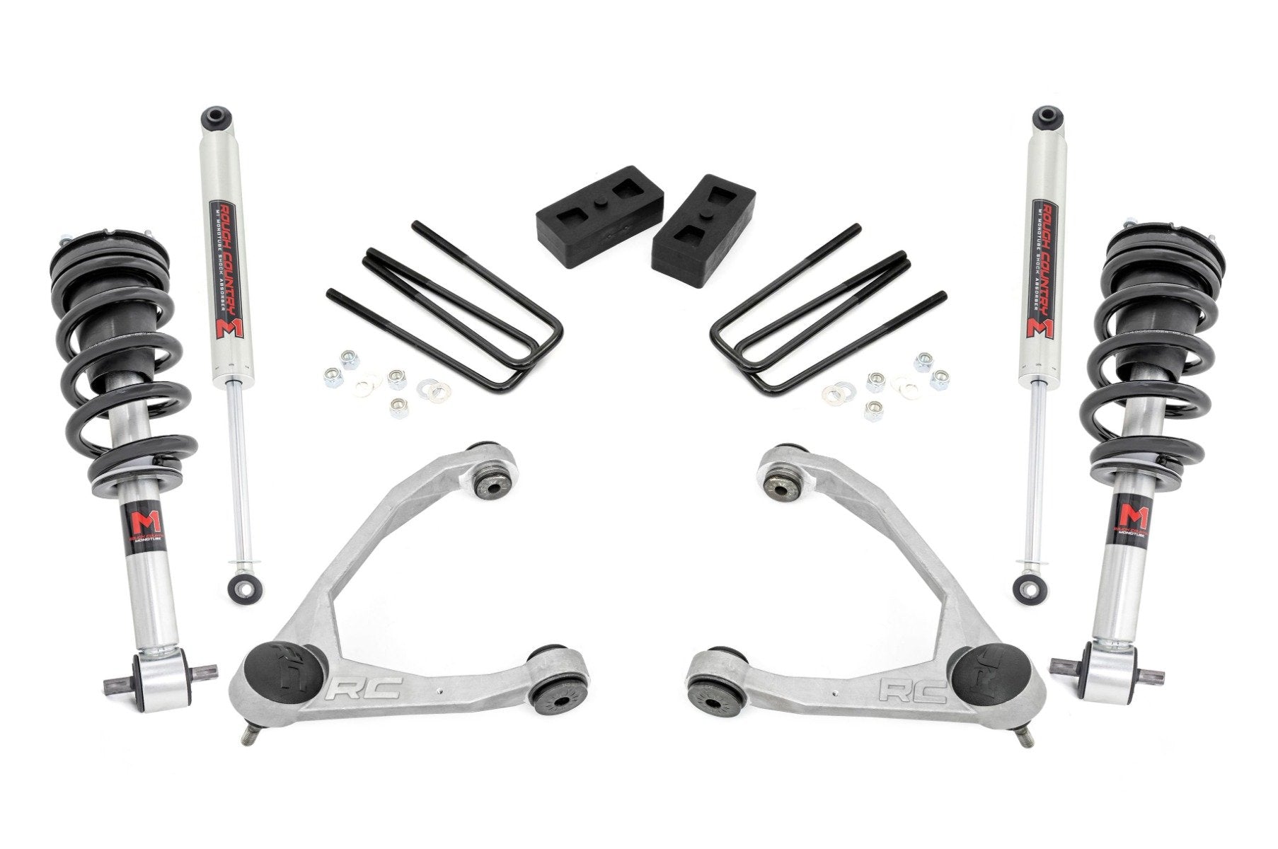 Here at Rough Country we work hard so we can play hard too! We want everyone to enjoy the off-road lifestyle with us, so we offer well-engineered equipment at an incredible value, and back it with top quality, unbeatable service and a lifetime warranty.This all-inclusive kit comes with several fantastic features - all at a price that'll leave plenty of room for new tires and wheels! Our Nitrogen charged M1 Shocks offer the best in balanced performance for on and off-road use, featuring a 10-stage velocity sensitive valving custom tuned for this specific application. That means these shocks are specifically valved for use with this specific vehicle and lift combo, giving you unparalleled performance for any driving situation.This kit also features upgraded Ball Joints by MOOG, the most trusted name in Ball Joint design. Easy to install and easier to maintain than any other joint on the market, the Moog Ball Joint system utilizes two powdered-metal &gusher& bearings with grease grooves to provide the most durable wear surface available. A sealed boot design with grease-relief valve keeps contaminants out while providing a sealed, serviceable environment. Also included in this kit are a set of fabricated rear blocks. Fabricated blocks are stronger and offer a longer lifespan than cast blocks while being less susceptible to damage and the environment. This kit also includes Rough Country's Performance M1 Struts for improved tire contact with the road and increased stability and performance.These struts are engineered to fit perfectly on each intended application, and feature a pre-installed coil spring for easy installation without the need for strut disassembly. Simply remove your factory strut and replace with this easy, convenient system. The result is an increased ride height that mimics the factory responsiveness and handling of the OE strut.