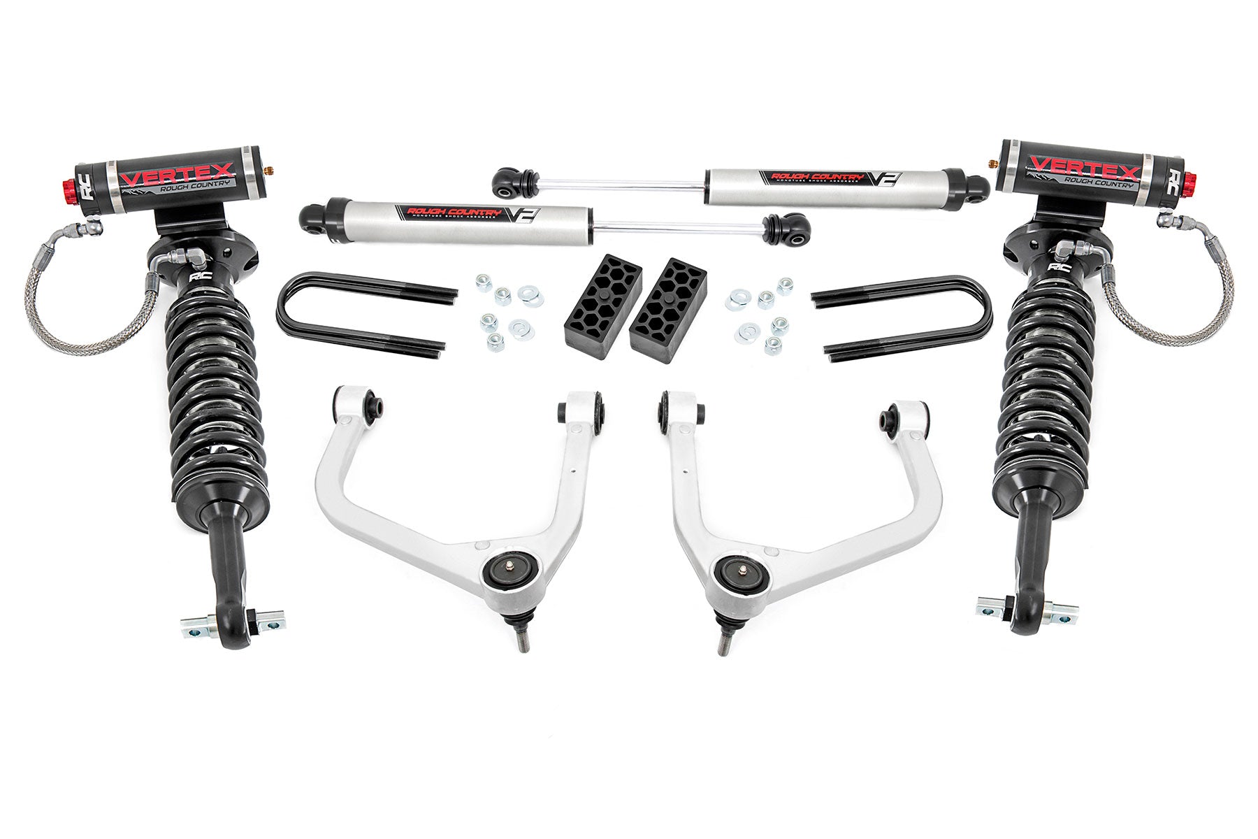Explore New Heights. With the rise of the new generation, Chevy decided that it was time to redesign one of their most beloved trucks and tap into some familiar technology by utilizing rear composite leaf springs. Chevy's fourth generation 1500 features an impressive all-new design thatΓÇÖs built from the ground up, with aggressive angles and head-turning stylings that fit in beautifully when transformed with Rough CountryΓÇÖs 3.5-inch Suspension Lift.\Innovative Design and Construction. When changing a vehicle's suspension, the key to preserving ride quality is keeping the geometry of all suspension components as close to their factory angles as possible. With Rough Country's six-inch lift kit specifically designed for the rear mono-leaf equipped models, you can rest easy knowing that everything is included for installation. Rough Country's 3.5in lift features a set of forged aluminum upper control arms to provide the correct suspension geometry in our most durable control arm to date! This perfect-height lift is a great choice for anyone who wants more than a simple level but doesnΓÇÖt quite want the full height of a 3.5-inch option. This kit lifts and levels the front of the vehicle with the rear, offering enough increased ground clearance to run up to 295/55R20 tires with an improved, aggressive look. We didn't want to limit you to one standard kit. Rough Country's 3.5-inch kit is configurable with all the shock options that we offer. This allows you to choose which shock series you want! Ranging from our nitrogen-charged N3 shocks to our Vertex reservoir shocks the power to choose is in your hands.\Installation. Requiring the use of a strut compressor to install, an estimated timeframe of 5-6 hours is recommended to complete this full installation. This full kit can be installed at home and can be completed efficiently and quickly!\Limited Lifetime Replacement Warranty. Rough Country's 3.5" Suspension Lift Kit is backed with a limited lifetime replacement warranty towards manufacturer defects. As such, the product is protected from structural and workmanship damage after the date of purchase. With our industry-leading warranty give yourself peace of mind when using Rough Country's Suspension products!