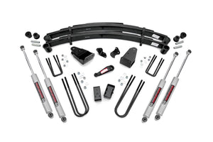 Give your 87-97 Ford F-250 an impressive upgrade, front to back with Rough CountryΓÇÖs 4" Ford Suspension Lift Kit! This easy-to-install lift kit raises the front of your vehicle to be the equal height with the rear for a leveled, better-than-stock look that gives an improved ride height and more aggressive appearance.\This kit features a set of front, lifted leaf springs allowing you to gain additional ride height without sacrificing ride quality or performance. A set of I-Beam drop brackets and track bar brackepitman armt are provided to keep everything at optimum angles for a factory-like ride, even after lifting.\A set of Rough Country's premium N3 shocks are also included. These fine-tuned 10-stage variable high-pressure Nitrogen charged shocks offer a fantastic blend of off-road action and smooth highway ride quality. With a durable 18mm spring-loaded piston rod and a faster-cooling 54mm shock body.\Get the wheels you want! Rough Country's 4" Ford Suspension Lift Kit comes with everything you need to fit up to a 35" tire with proper wheel backspacing.\Best of all, Rough Country's 4ΓÇ¥ Ford Suspension Lift Kit is backed by our Lifetime Replacement Warranty.