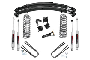 Give your Ford an aggressive look from front to rear with Rough Country’s 4" Ford Suspension Lift Kit! This easy-to-install leveling kit raises the front of your vehicle to be equal height with the rear for a leveled, flush look that gives a better ride height and more aggressive appearance.\ This kit features a set of front, durable coil springs allowing you gain additional ride height without sacrificing ride quality or performance. A set of 7 degree c-bushings and track bar drop bracket are provided to keep everything at optimum angles for a factory-like ride, even after lifting. Our leaf springs are double tapered with teflon pad inserts for a softer ride quality.\A set of Rough Country's premium N3 shocks are also included in this kit. These fine tuned 10-stage variable high-pressure Nitrogen charged shocks offer a fantastic blend of off-road action and smooth highway ride quality. With a durable 18mm spring-loaded piston rod and faster-cooling 54mm shock body.\Get the wheels you want! Rough Country's 4" Ford Suspension Lift Kit comes with everything you need to fit up to a 35" tire with proper wheel backspacing.\Best of all, Rough Country's 4" Ford Suspension Lift Kit is backed by our Lifetime Replacement Warranty.\
